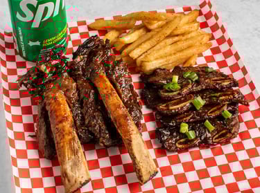 Two pieces of our slow cooked beef back ribs and four pieces of our grilled beef short ribs served with fries and a drink.